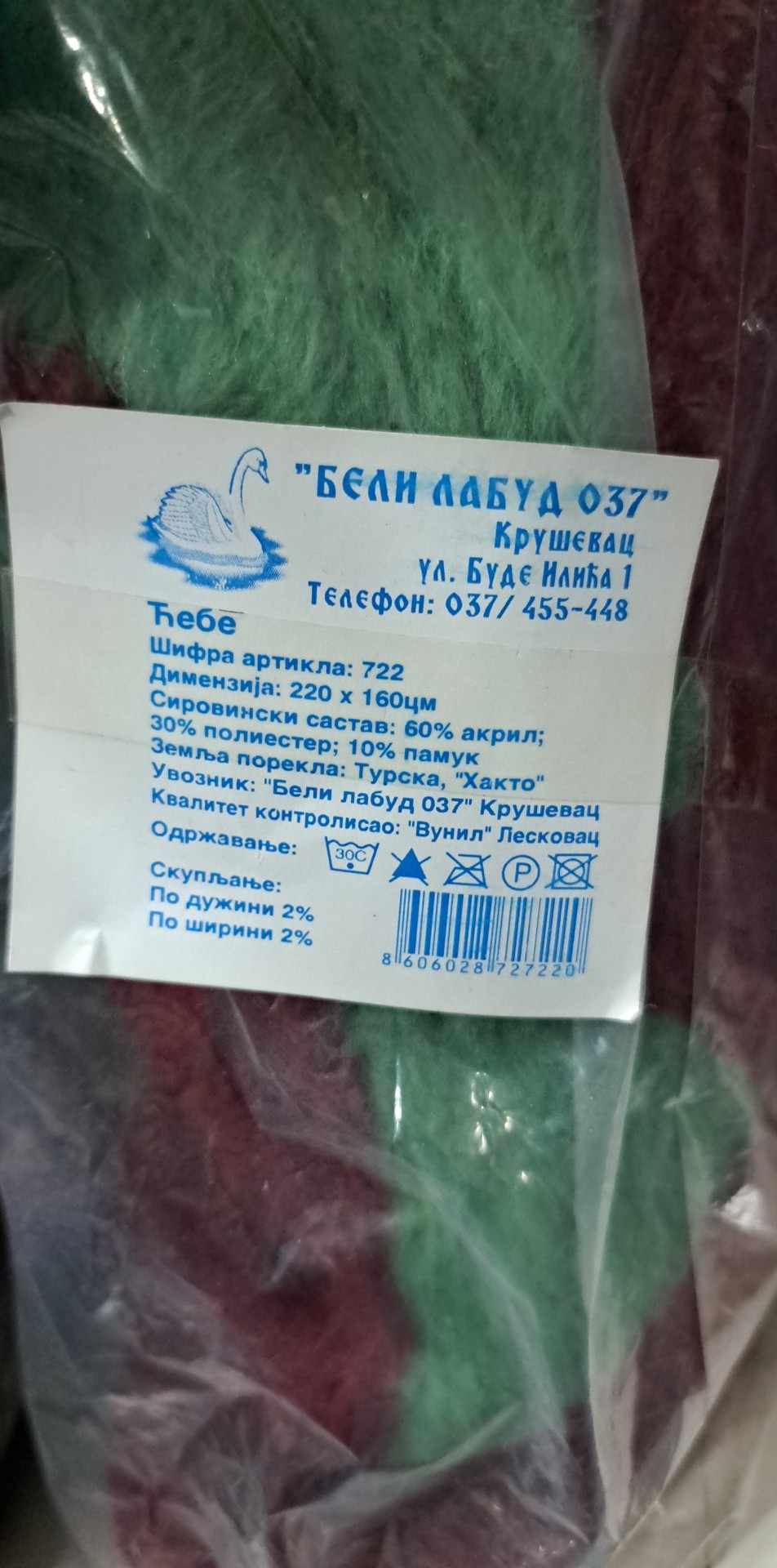 Ćebe dimenzija 220x150cm, sa sastavom od 60% akrila, 30% poliestera i 10% pamuka, kombinuje toplotu, mekoću i trajnost, pružajući idealan omjer udobnosti i praktičnosti. Ova mešavina materijala osigurava da ćebad bude izuzetno mekana na dodir, dok istovremeno nudi dobru izdržljivost i lakoću održavanja. Akril dodaje volumen i toplotu, poliester povećava izdržljivost, a pamuk unosi prirodnu mekoću i prozračnost, čineći ovo ćebad savršenim izborom za hladne noći. Idealno za upotrebu kao dodatni sloj topline na krevetu ili za udobno umotavanje tokom opuštanja na kauču, ovo ćebe spaja funkcionalnost s udobnošću, doprinoseći toplijem i prijatnijem ambijentu vašeg doma.