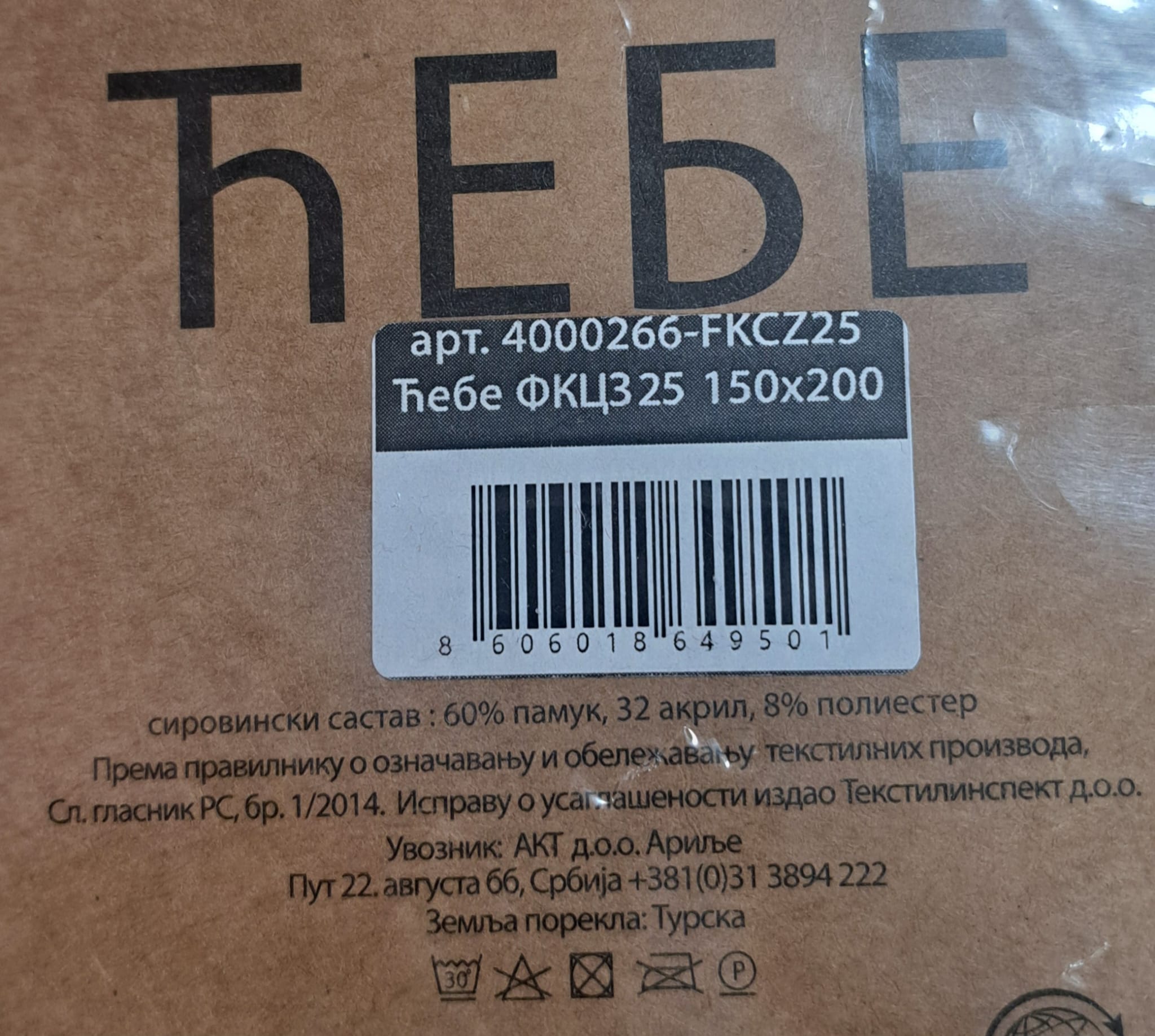 Ćebe Crvena Zvezda dimenzije 200×150 cm izrađeno je od pažljivo izbalansirane mešavine prirodnih i sintetičkih vlakana, sa dominantnim udelom pamuka koji obezbeđuje izuzetnu mekoću i prozračnost. Sirovinski sastav od 60% pamuka, 32% akrila i 8% poliestera pruža prijatan osećaj na koži, uz dobru termičku izolaciju i dugotrajnost u svakodnevnoj upotrebi.